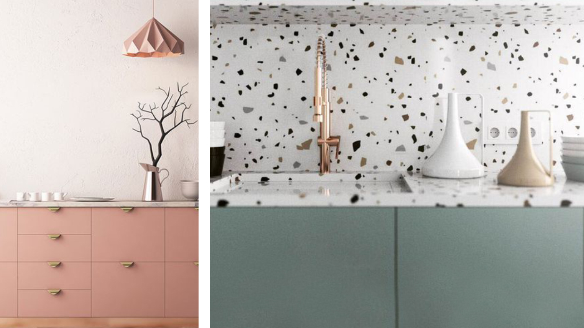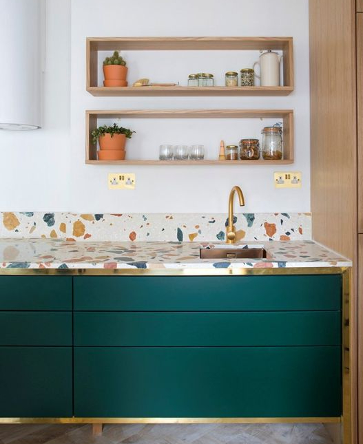Vorrei qui menzionare una delle ultime tendenze dell’interior design: l’effetto graniglia o ,come viene ultimamente chiamato in tutto il mondo, ‘terrazzo’, dal suo nome completo battuto di terrazzo alla veneziana. Applicato in cucina, sia per il top che per il paraschizzi, offre interessanti risultati.