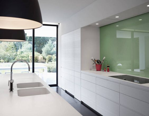 L’utilizzo del vetro temperato laccato è una delle ultime tendenze. E’ molto elegante e permette di avere un alto livello di personalizzazione, dal momento che lo si può scegliere in un qualsiasi colore della gamma dei RAL e può persino essere decorato con disegni. E’una soluzione molto efficace sia dal punto di vista funzionale, sia da quello estetico: è facile da pulire e permette di mimetizzare o mettere in risalto quella parte della cucina. Unica pecca: non è tra le soluzioni più economiche.