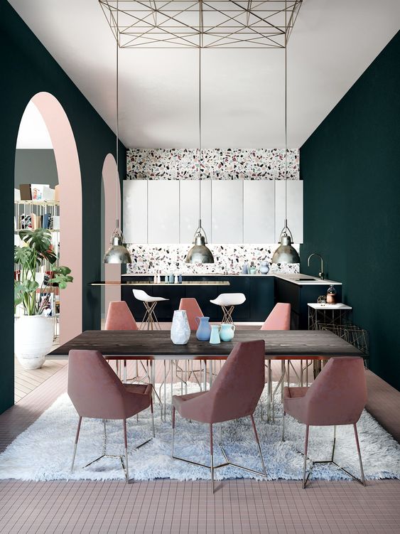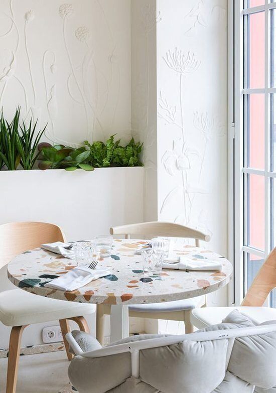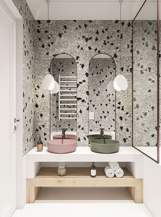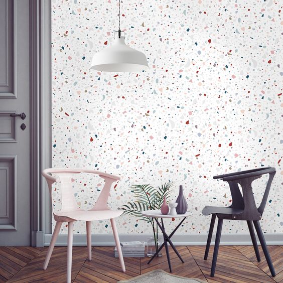 Sono tantissimi gli esempi di carte da parati ispirate alla graniglia. Filo conduttore il minimalismo, colori vivaci e abbinamenti inusuali. Lo stesso vale anche per arredi, come tavoli o tavolini, e complementi, come vasi e lampade. Se ti piace l’effetto ottico, ma hai paura di osare su grandi superfici, questo è un modo per averlo a casa, magari su oggetti piccoli o molto piccoli.