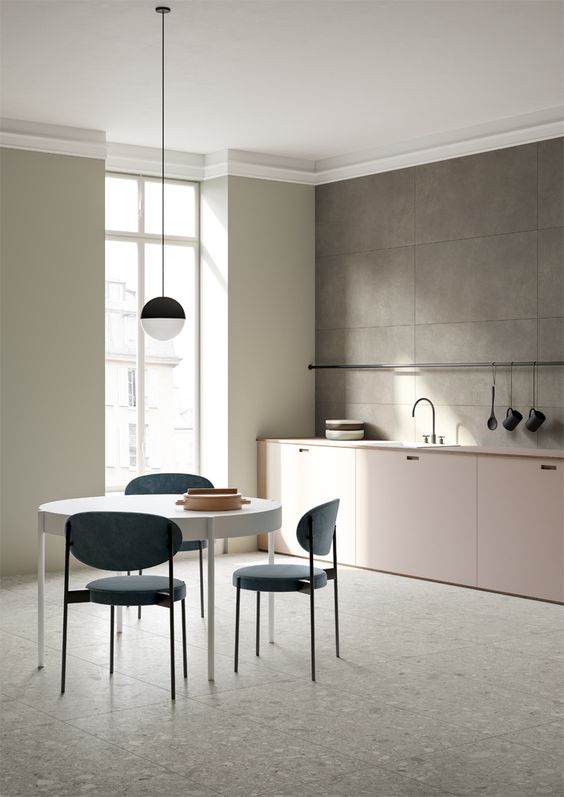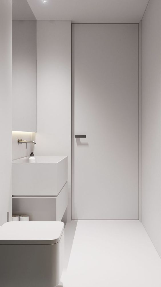 Il bianco aiuta molto ad esaltare il concetto di essenziale, ma lo si può accostare ad altri colori e finiture, come il grigio, il tortora, il cipria o l’ocra, o ancora colori tenui e soft, come carta da zucchero.