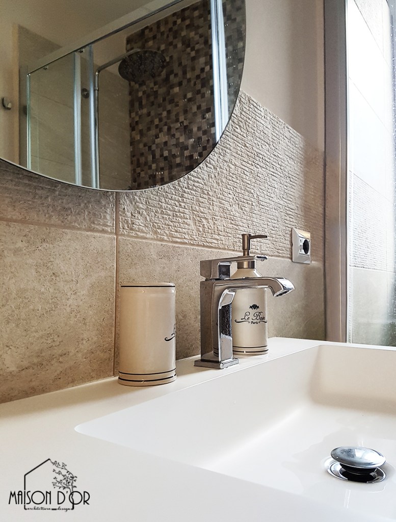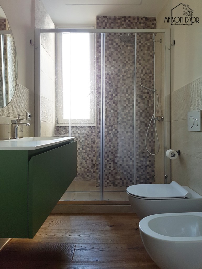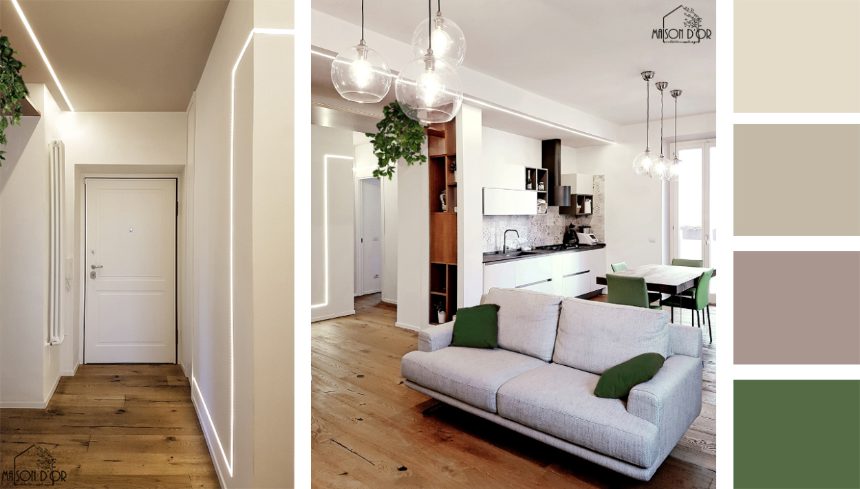 Ragion per cui, la scelta dei colori è ricaduta su una palette neutro-calda, consentendo l’ingresso di una sola nota colorata in tutti gli ambienti, il verde salvia, uno dei colori trend della stagione 2019-20.