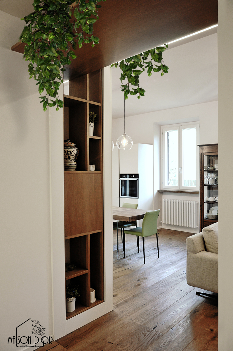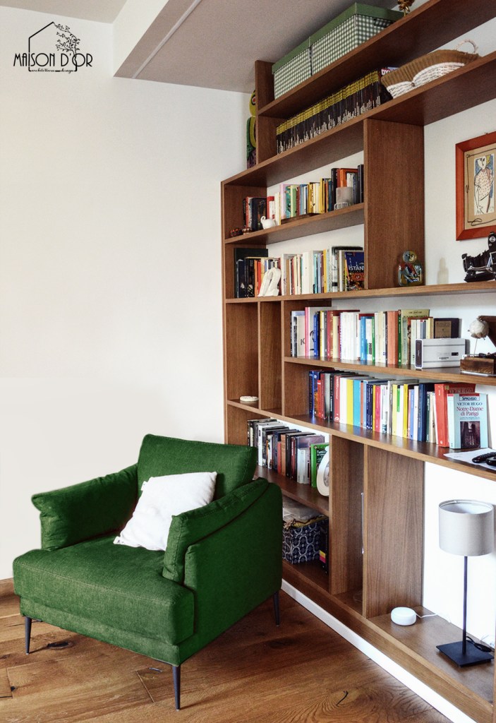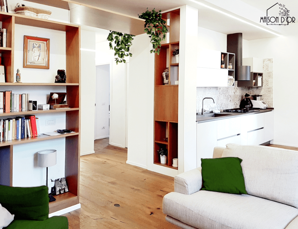 Il pezzo forte dell’intero progetto è rappresentato dalla libreria a muro, da noi progettata e realizzata grazie all’intervento di Paletti infissi srl. Questa, oltre che come parte integrante del soggiorno, è pensata come una zona-filtro tra l’ingresso e l’open space, dato che permette di nascondere, alla vista di chi entra, la cucina.