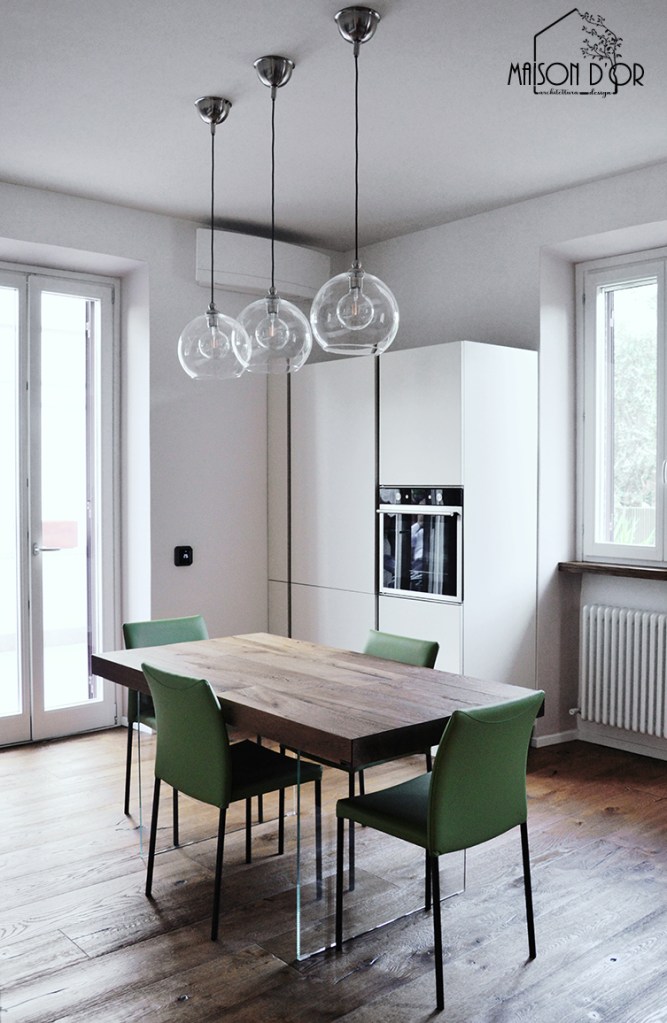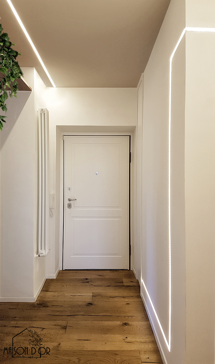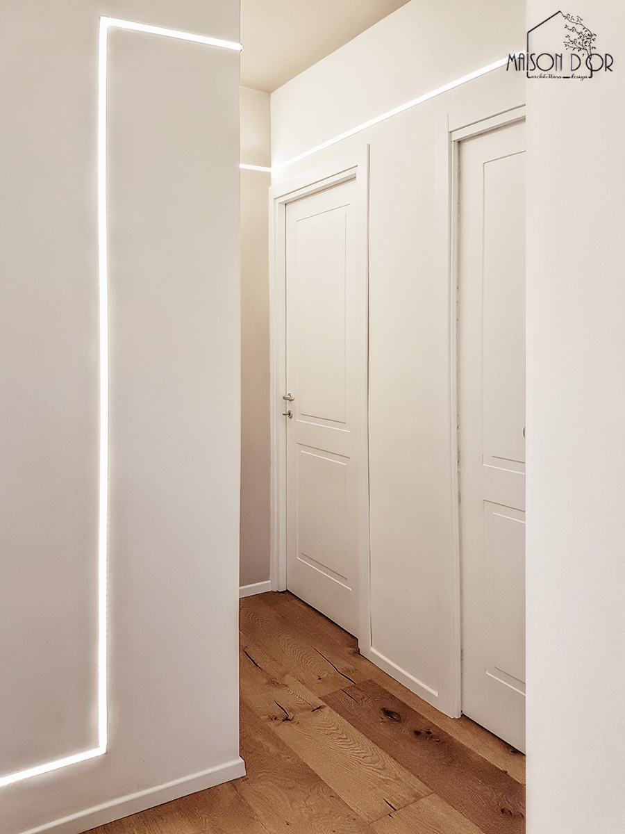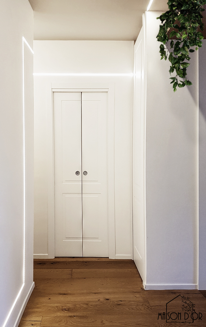 La “neutralità” è stata mantenuta anche per le luci, con la scelta di usare strip led in quasi tutti gli ambienti e qualche lampadario a sospensione in vetro trasparente o opaco.