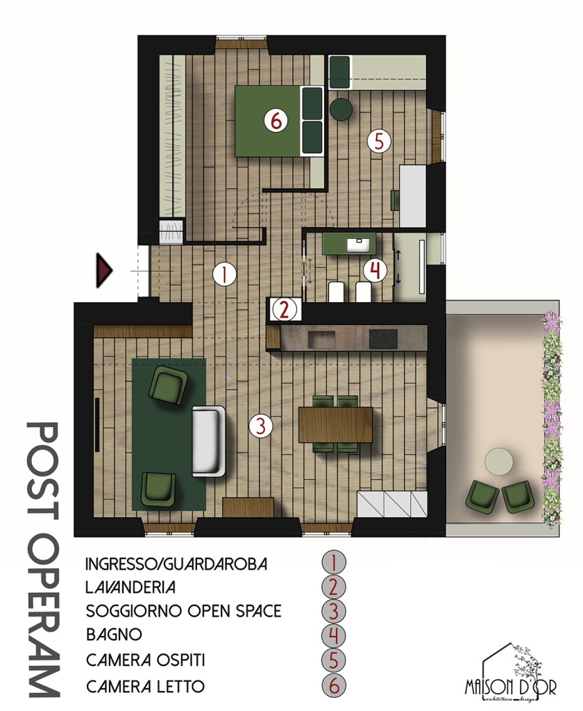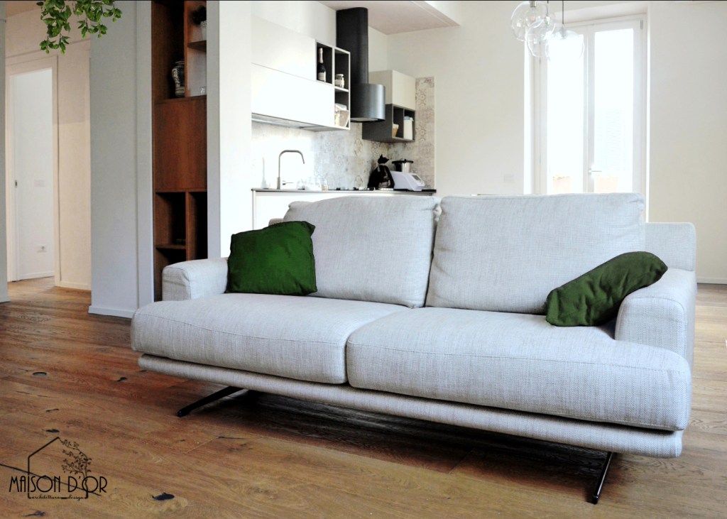 Mari e Pasquale sognavano di fare della loro nuova casa soprattutto un posto accogliente e conviviale, pronto a ricevere amici e parenti, per gustose cene e rilassanti chiacchierate. Motivo per cui avremmo dovuto concentrarci soprattutto sulla zona giorno: un open-space con angolo cottura che affacciasse sullo splendido terrazzo. Era proprio quel terrazzo, luminoso e spazioso, che li aveva fatti innamorare.