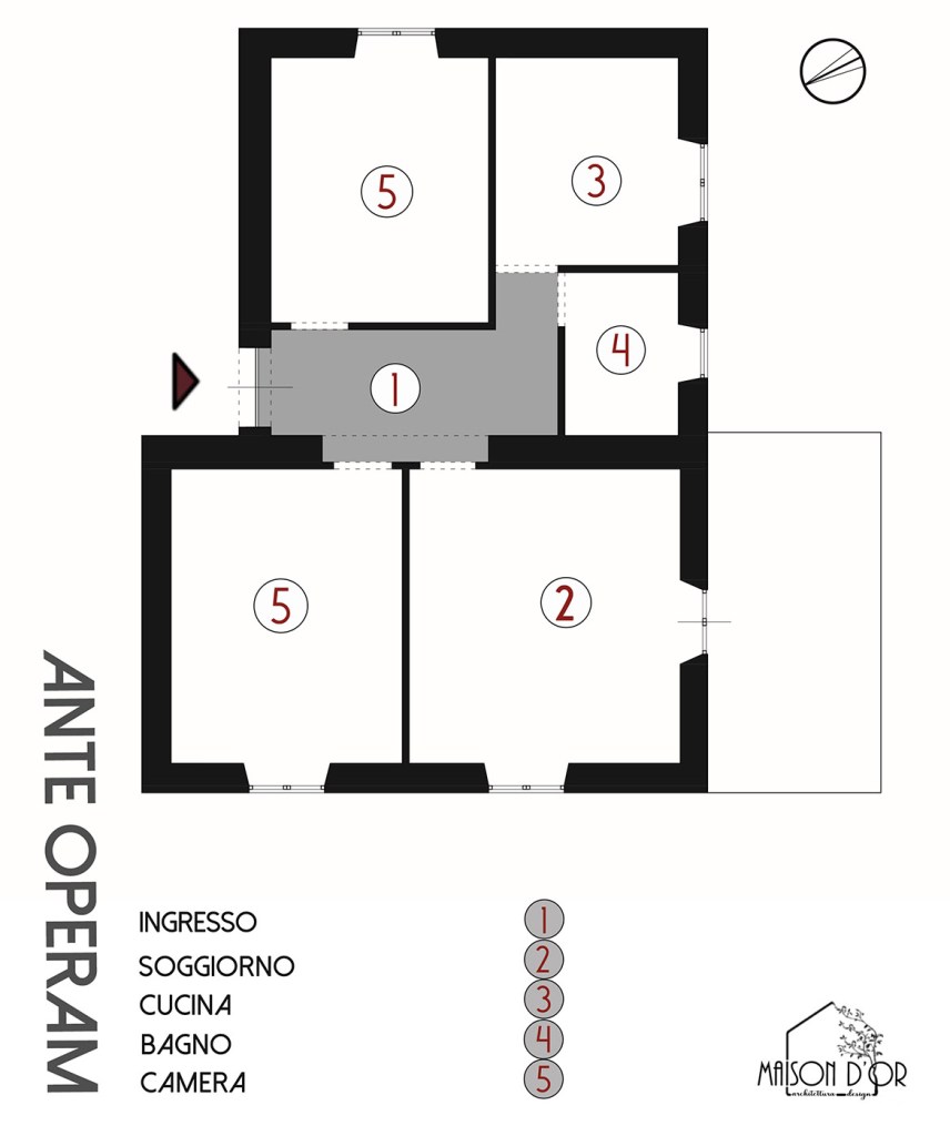 Si è deciso di separare, seppur non in modo così netto, la zona giorno e la zona notte, posizionandole rispettivamente in due ali opposte della casa; la divisione concettuale e fisica è rappresentata dal grosso muro portante situato proprio al centro. Quest’ultimo ci ha permesso di creare una sorta di portale tra l’ingresso e il soggiorno open space.