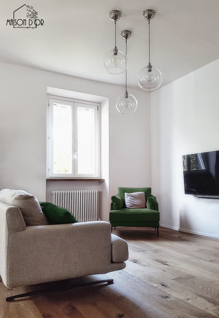 Ciò che ha caratterizzato le scelte in fatto di finiture ed atmosfere è stata la scelta del pavimento della casa: parquet in rovere con nodi, dai lunghi e larghi listoni, dall’aspetto tutt’altro che anonimo.