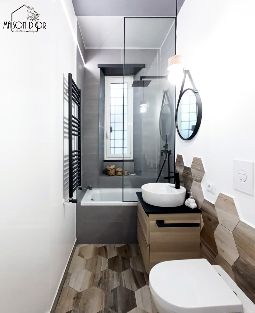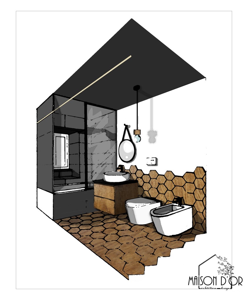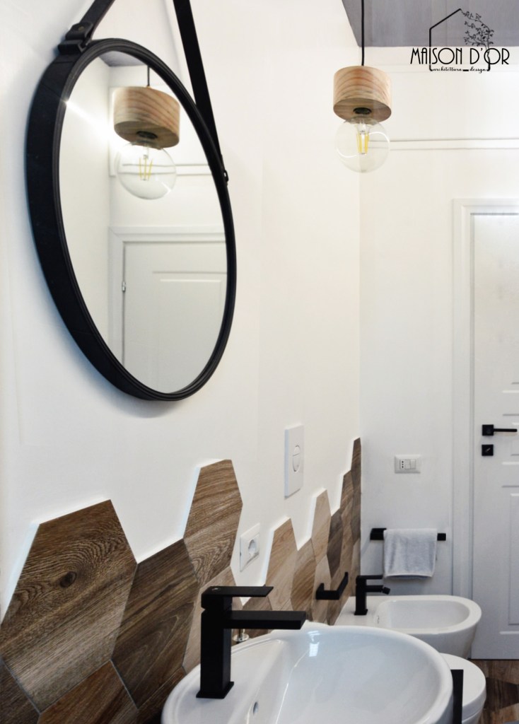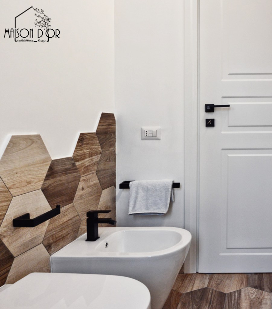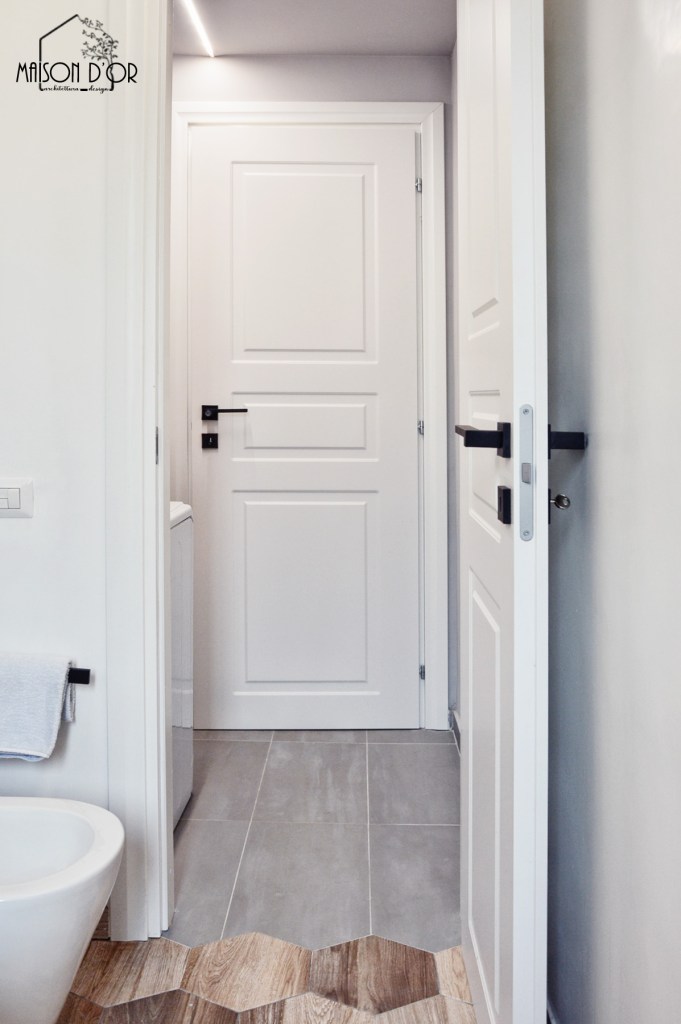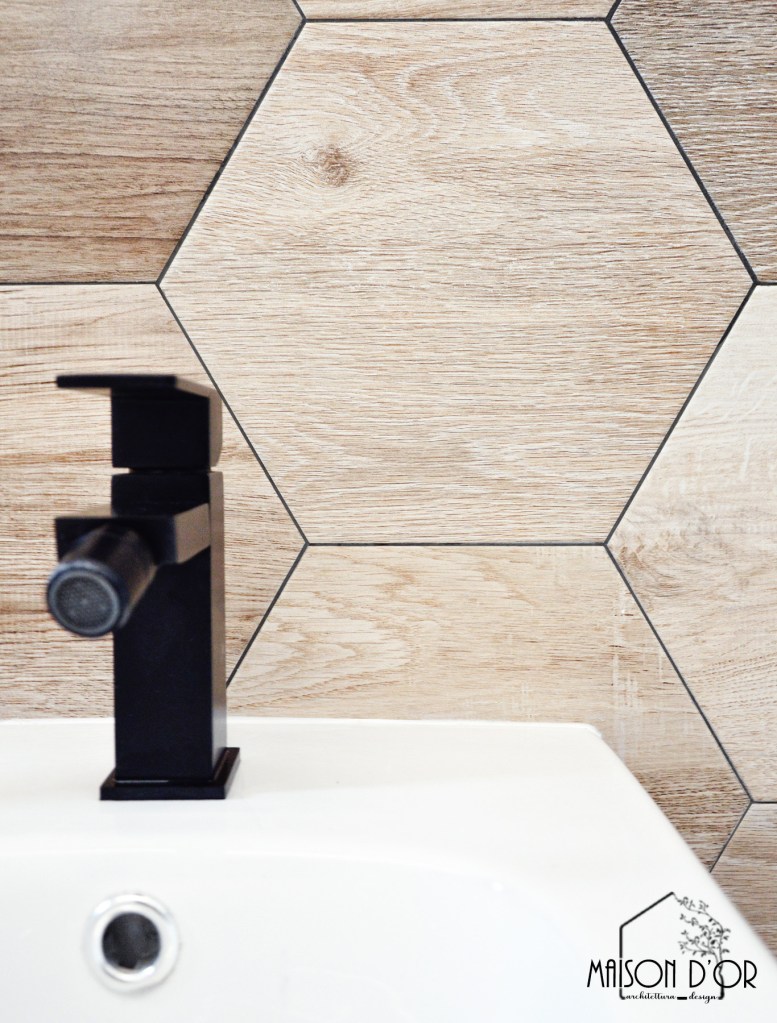 In tutta il resto della casa il pavimento è formato da listelli in laminato effetto legno, dunque si è scelto di riproporlo anche in bagno con le piastrelle in gres esagonali e nel riutilizzo del mobile del lavabo. Questo è stato mantenuto dal mobilio precedente con l’aggiunta di alcune modifiche: un nuovo top nero e una ciotola rotonda in ceramica.