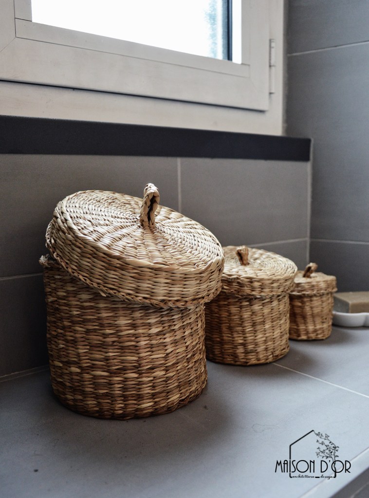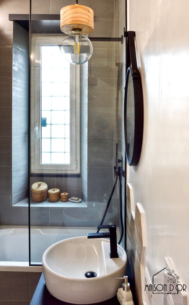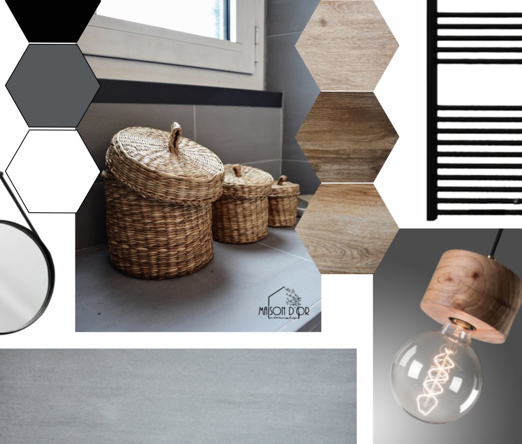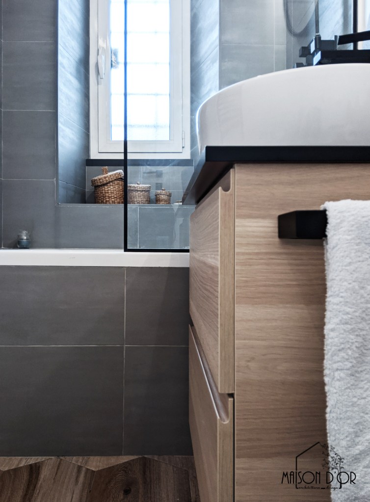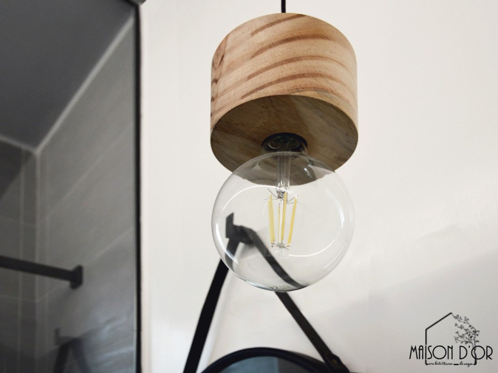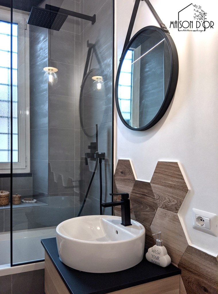 In tutta il resto della casa il pavimento è formato da listelli in laminato effetto legno, dunque si è scelto di riproporlo anche in bagno con le piastrelle in gres esagonali e nel riutilizzo del mobile del lavabo. Questo è stato mantenuto dal mobilio precedente con l’aggiunta di alcune modifiche: un nuovo top nero e una ciotola rotonda in ceramica.
