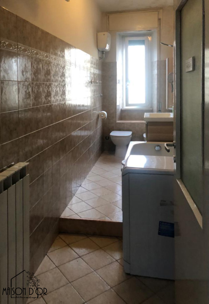 Affacciandosi sul soggiorno, era necessario creare anche un antibagno, che dividesse i due ambienti: lo avremmo sfruttato per posizionare l’angolo lavanderia, finora inesistente (è questo uno dei problemi del vecchio bagno).