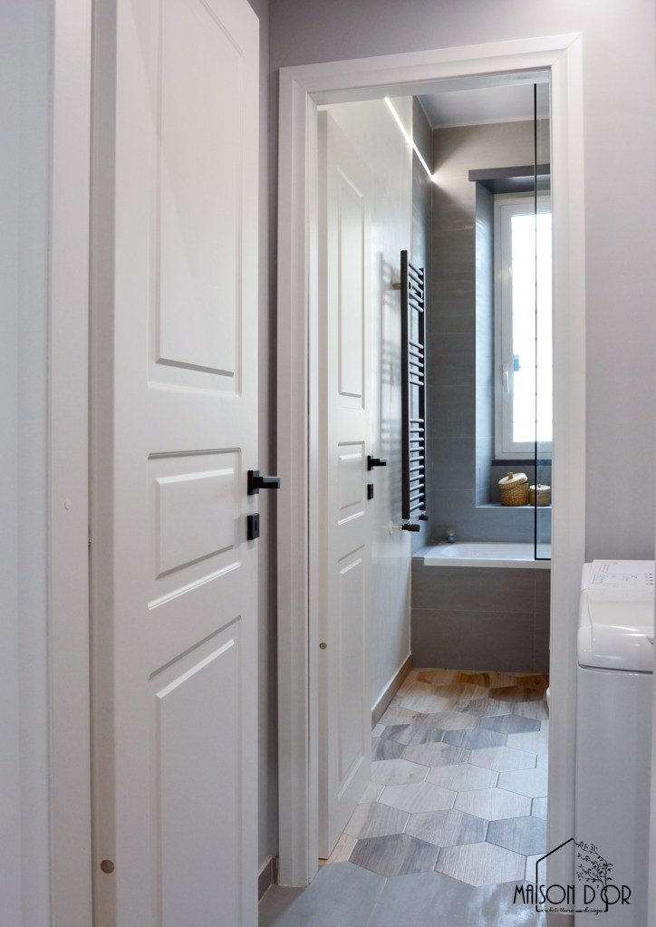 L’antibagno, come detto, era necessario. Ci ha permesso non solo di rendere poi il bagno meno lungo, ma anche di creare una zona per lavanderia, asciugatrice, cesta biancheria e ripiani, per far sì che il bagno fosse sempre in ordine ed essenziale. Altro spazio ricavato è quello sopra l’antibagno, accessibile dal bagno, qui chiuso da sue sportelli dello stesso colore del muro.