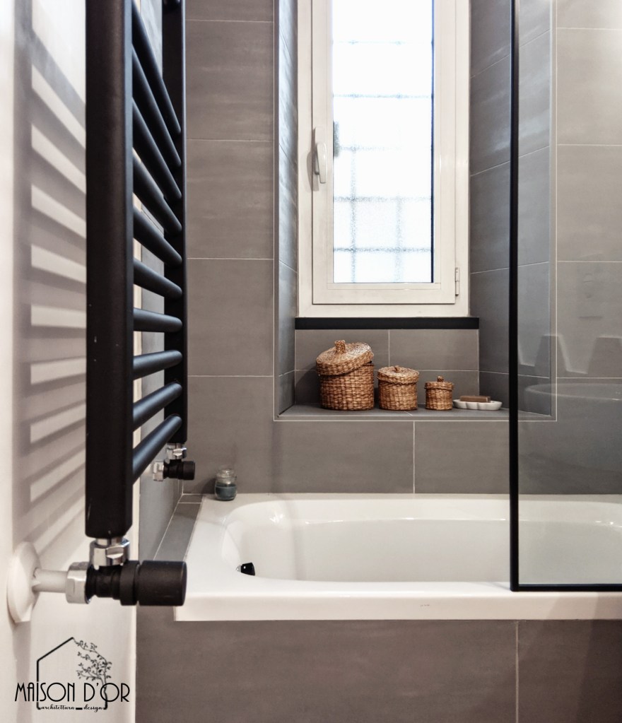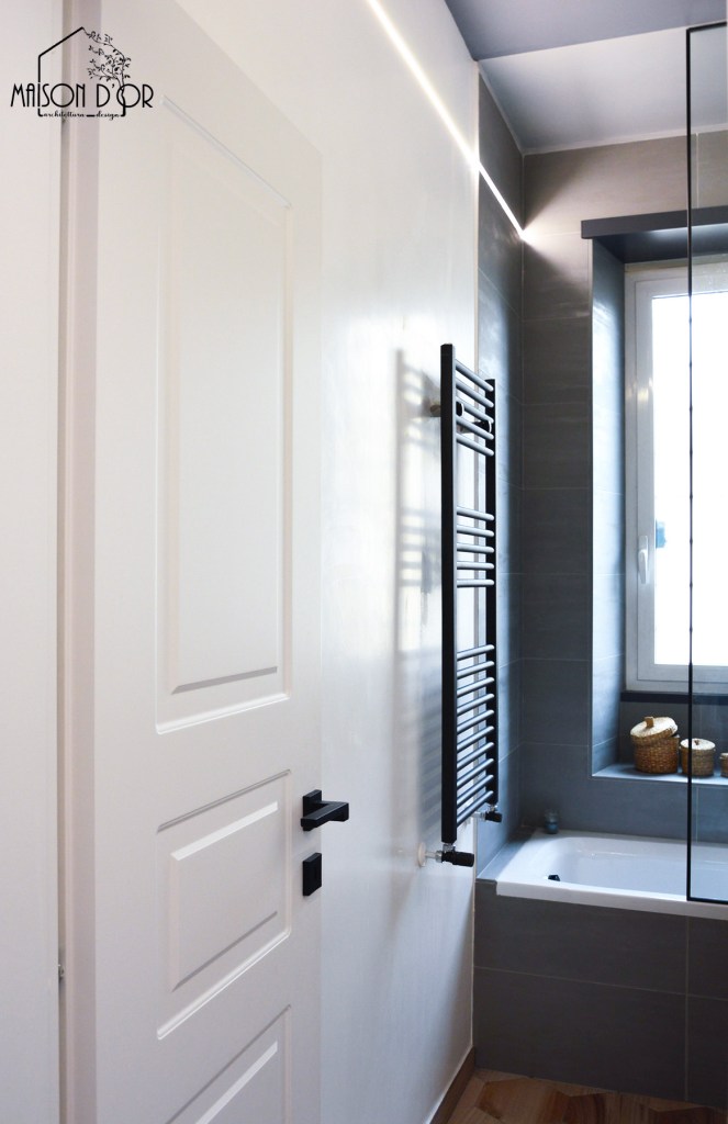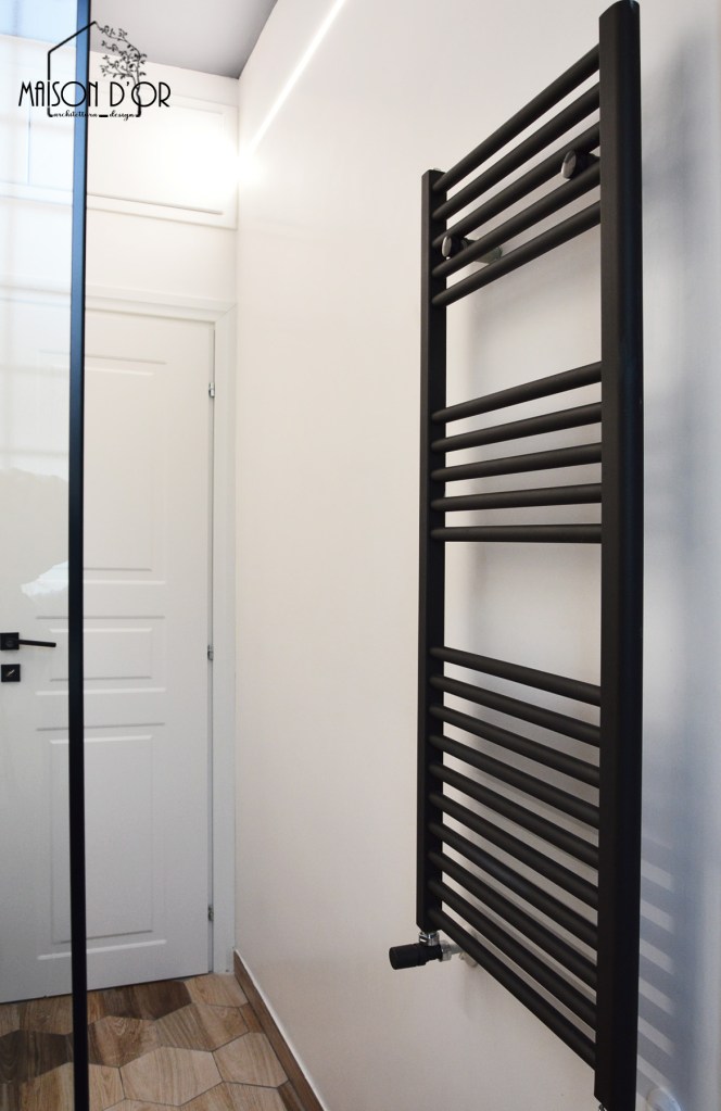 Come avrete notato ciò che dà la maggior caratterizzazione sono i dettagli, scelti tutti in un unico colore, il nero: rubinetteria, termoarredo, appendini, bordo del vetro sopra-vasca e anche fughe delle mattonelle!