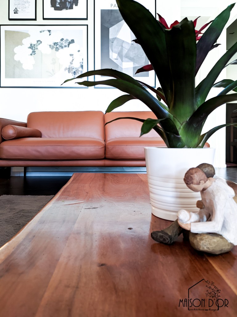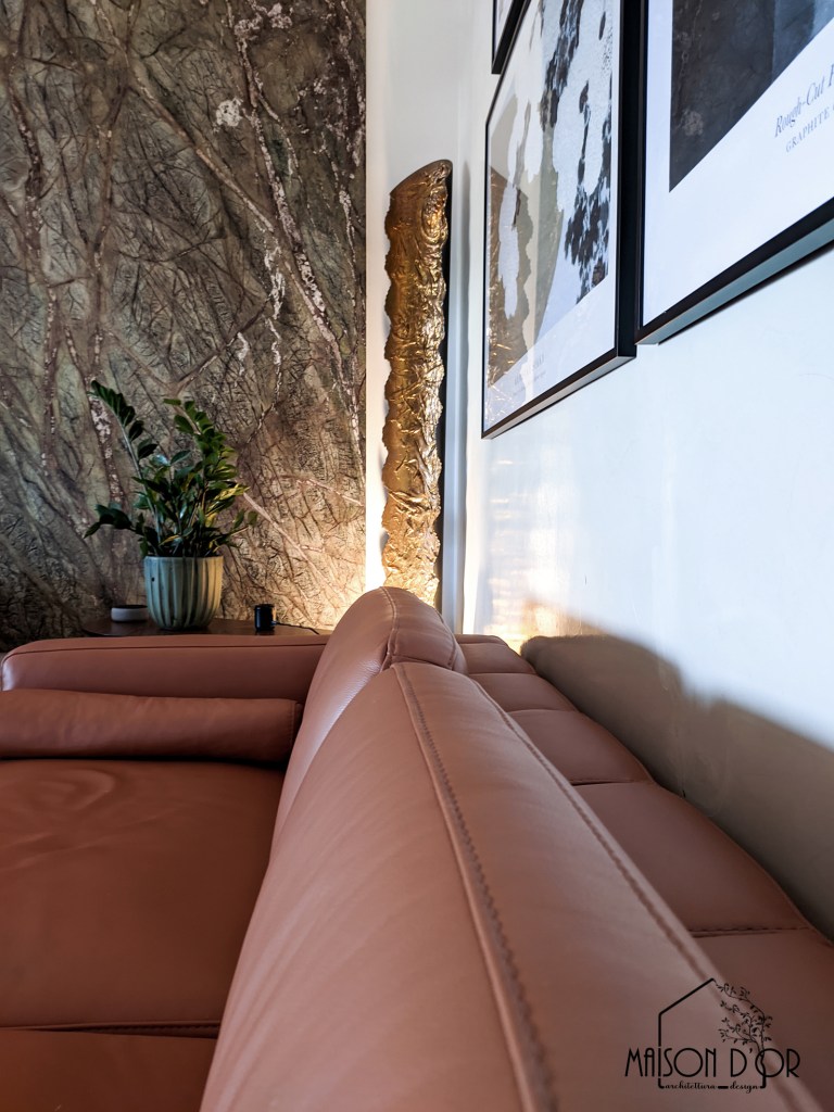 La si nota da subito già dall’ingresso di casa e accompagna i due nuovi divani in pelle, dai colori chiari e neutri, panna e cuoio. Con l’obiettivo di riutilizzare una vecchia lampada da terra in metallo con finitura dorata, a cui la famiglia era molto affezionata, questa è stata posta lateralmente alla lastra per metterla ulteriormente in risalto di sera, quando le luci del soggiorno si fanno più soffuse.