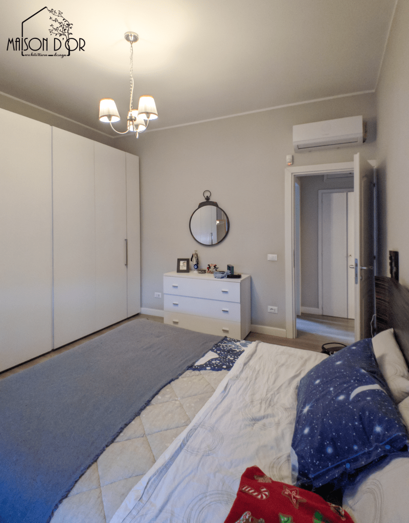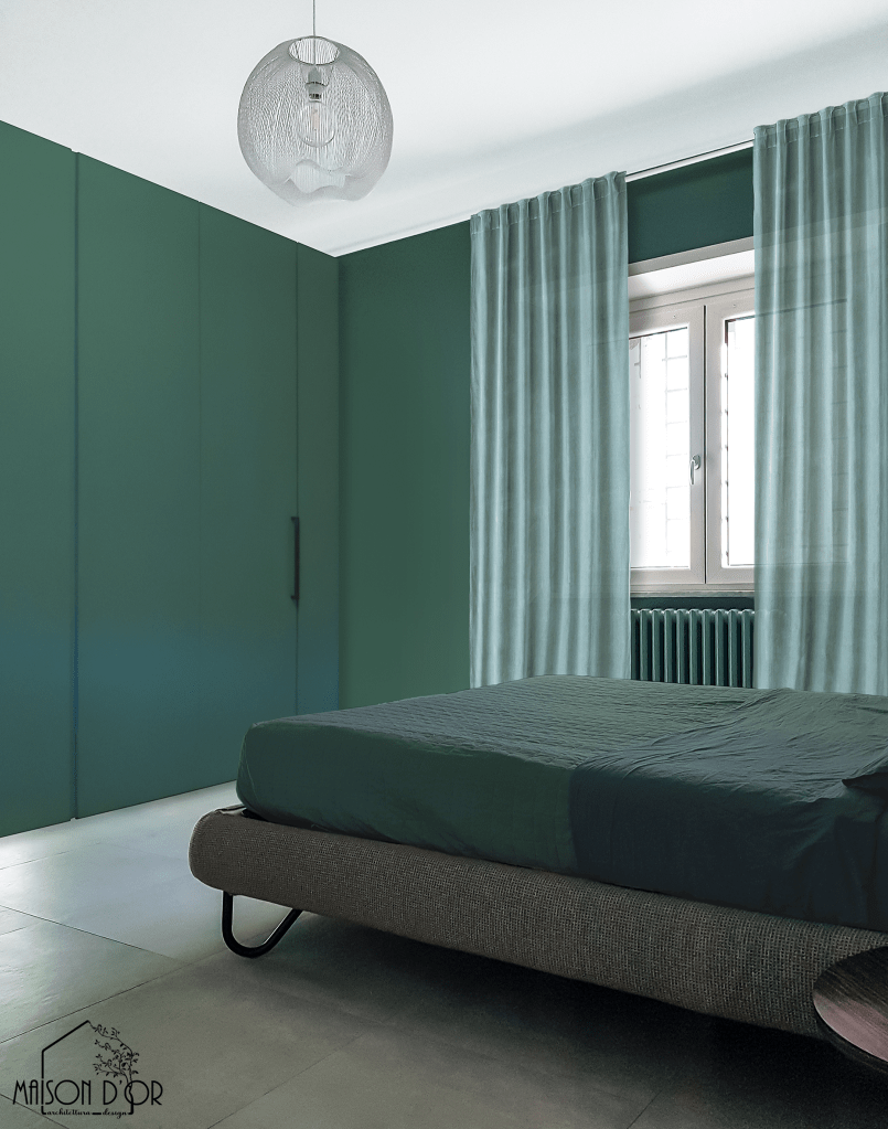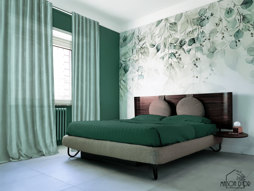 La camera da letto padronale (di cui qui sopra vediamo il prima e di seguito il dopo) è oggi una vera oasi di quiete: anche qui il verde domina le pareti e si estende su tessili e arredi, incluse le ante dell’armadio, rivisitate con un nuovo colore. Una carta da parati botanica fa da quinta scenica al letto preesistente, già importante nella sua forma, e lo valorizza con eleganza. Il risultato è avvolgente e intimo, perfetto per ricaricarsi.
