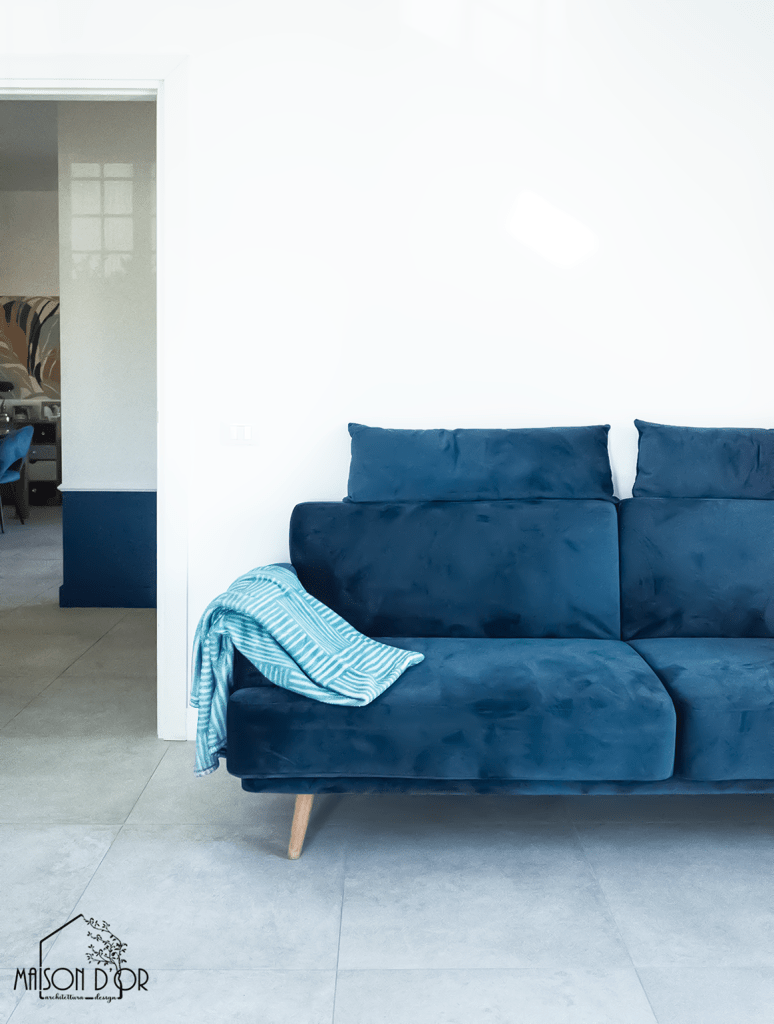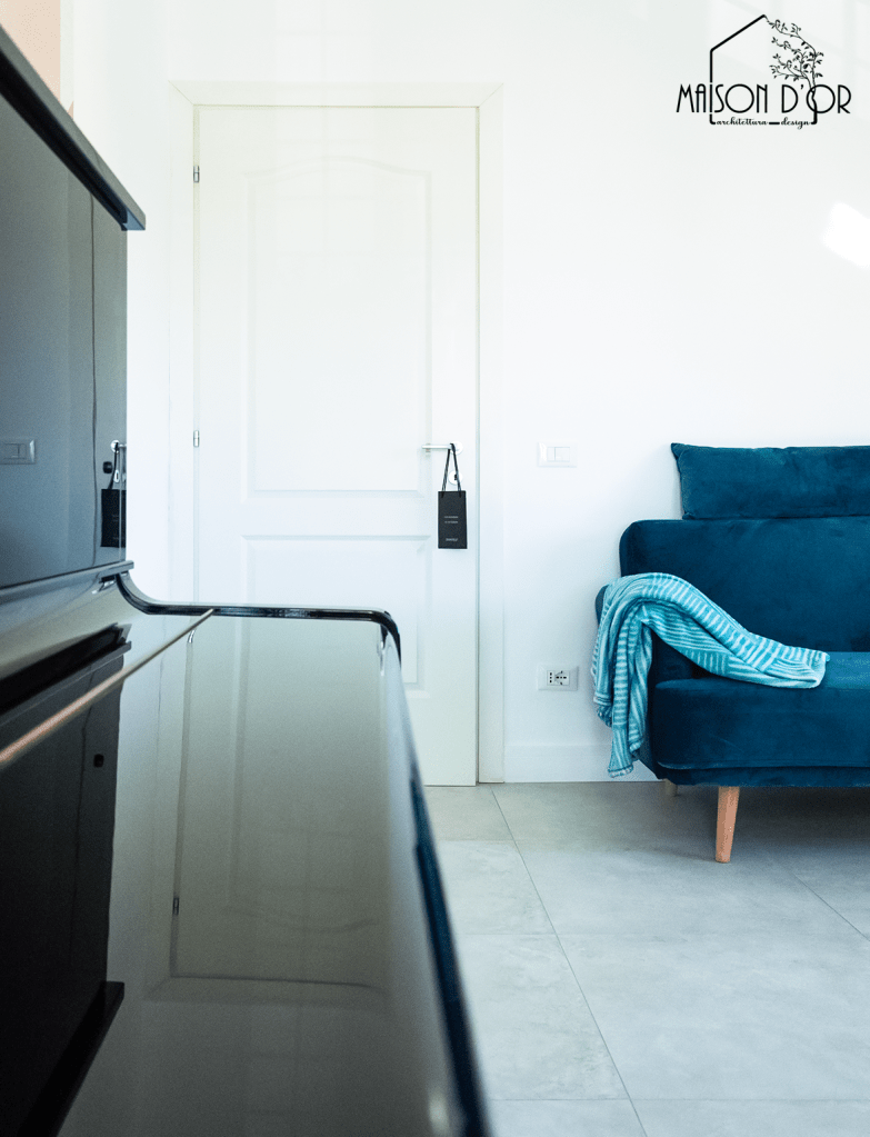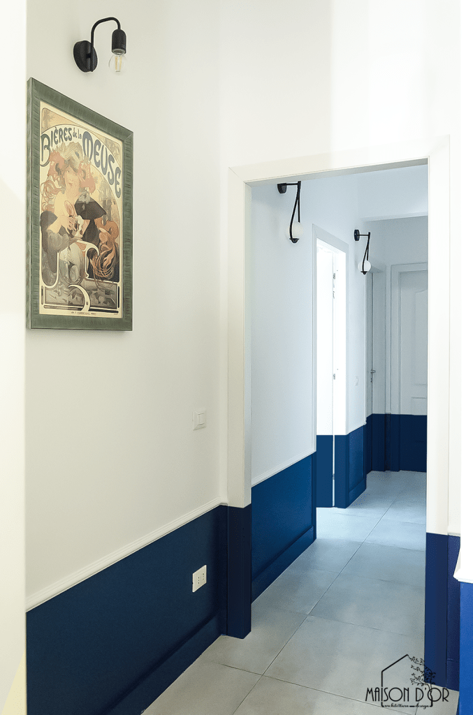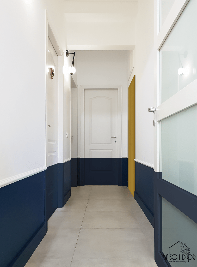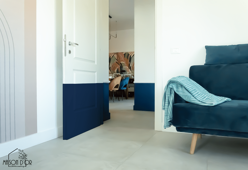Una delle soluzioni più riuscite e caratterizzanti è stata la striscia blu alta 50 cm che attraversa pareti e porte nella zona giorno e nel corridoio: un gesto decorativo che camuffa il battiscopa (uno dei desideri di S.) e al tempo stesso disegna una linea giocosa e riconoscibile.