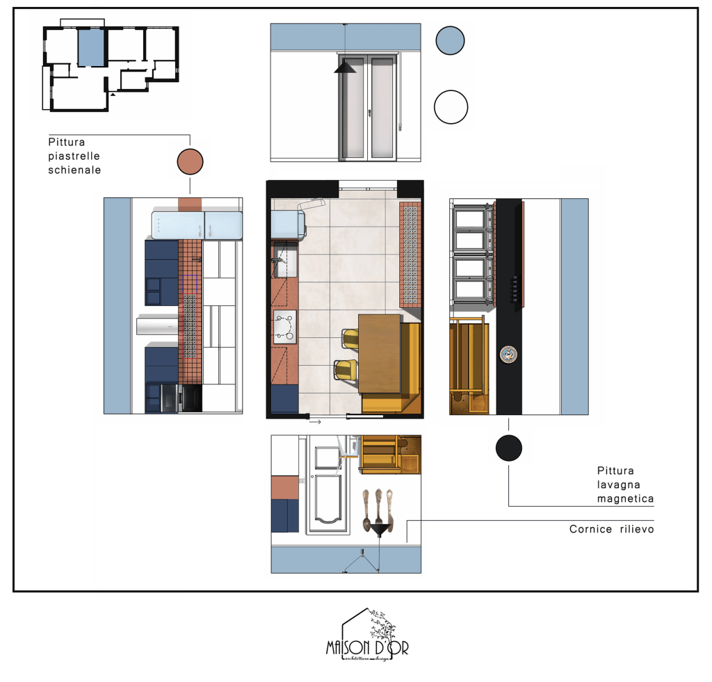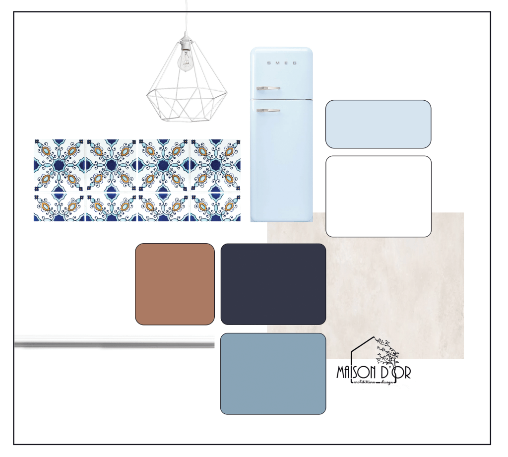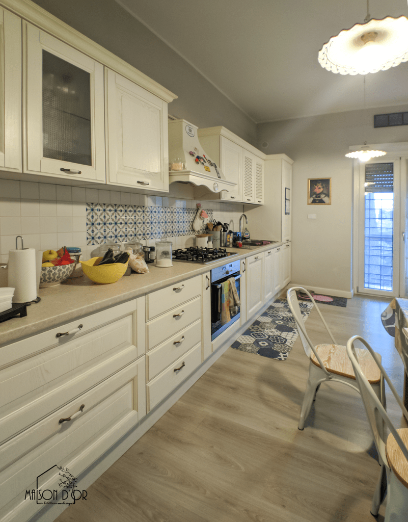 Lo stile della cucina aveva sicuramente bisogno di essere rinnovato, ma c’era un elemento che andava salvato anche qui: le piastrelle nel riquadro dietro i fuochi sono state disegnate a mano ed erano molto care a S. ; Proprio da qui siamo partiti per creare tutto l’intorno.