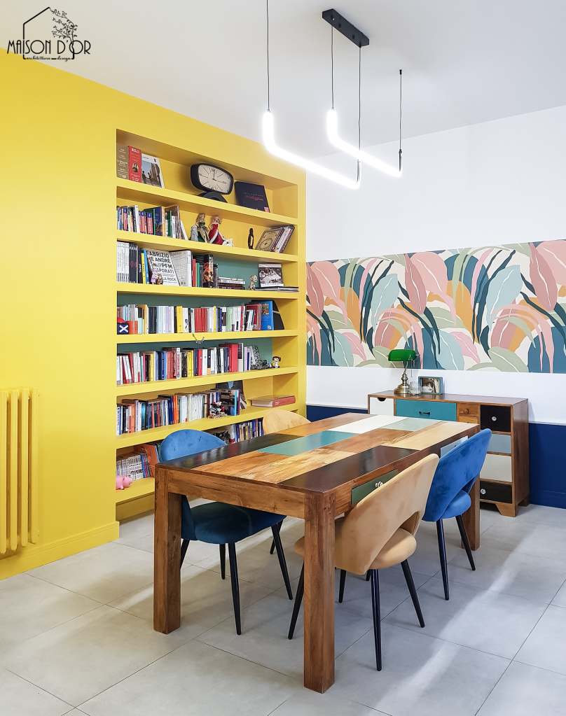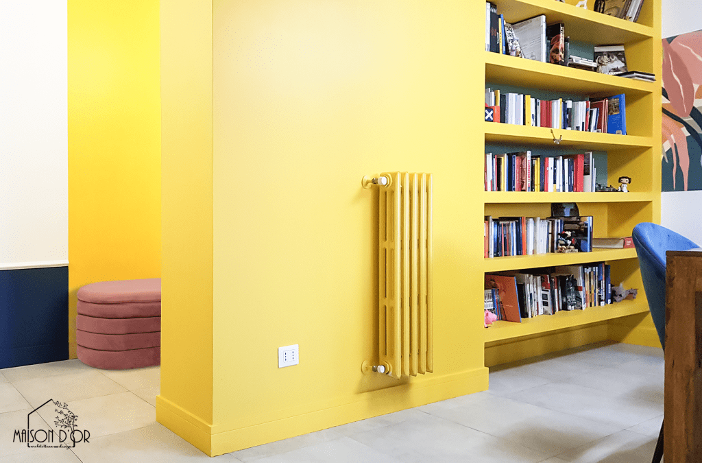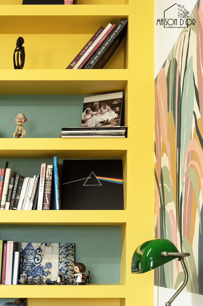 Dietro al tavolo in legno, la vera svolta: una libreria gialla realizzata su misura, all’interno di una nicchia prima inutilizzata; è bastata lei per creare l’ effetto wow nella stanza.