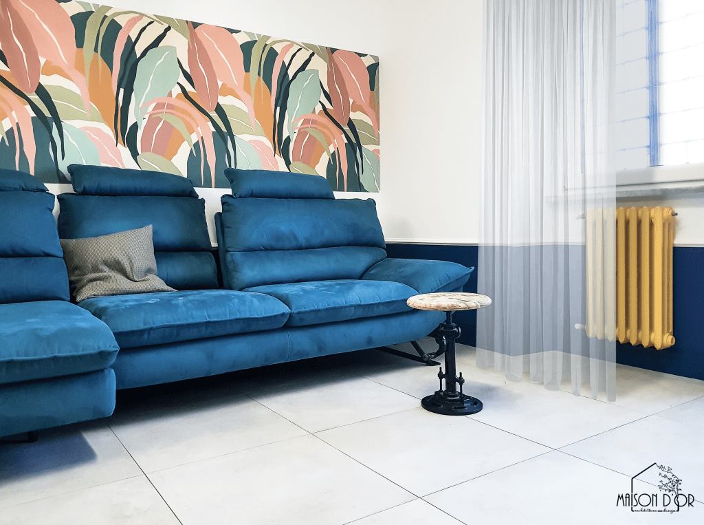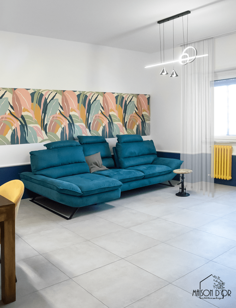 Il nuovo protagonista è il divano ottanio, spazioso, elegante e accogliente. Alle sue spalle, una carta da parati racchiude tutta la palette cromatica scelta in un’esplosione equilibrata che dà ritmo e armonia all’ambiente.