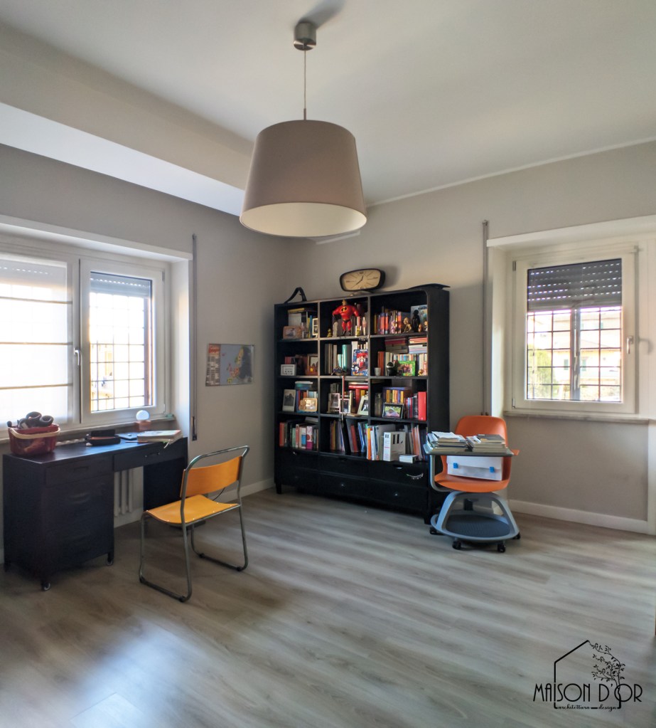 Anche lo studio, seppur ampio e luminoso, sembrava sospeso. L’arredo non dialogava tra sé né con le pareti. Mancava inoltre un link col resto della casa.