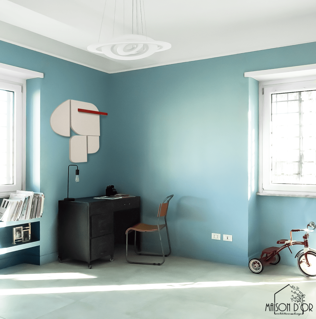 Una carta da parati a disegno rosa e blu dialoga con toni di azzurro e blu, rendendo l’ambiente energizzante e luminoso, ma anche rilassante all’occorrenza. Una zona libreria, creata appositamente sotto la finestra, organizza e contiene senza appesantire.