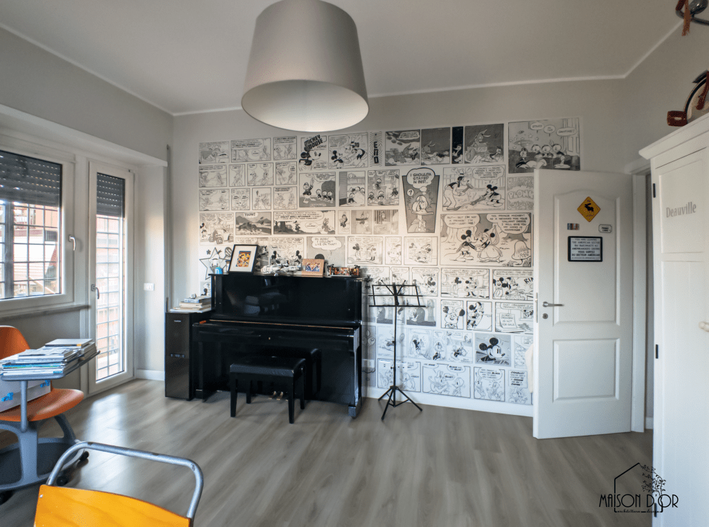 In questa stanza, ora trasformato in una stanza multifunzione, convivono anime diverse: è spazio di lavoro e studio, ma anche luogo dove si suona il pianoforte e si ospitano amici, grazie all’aggiunta di un divano letto.