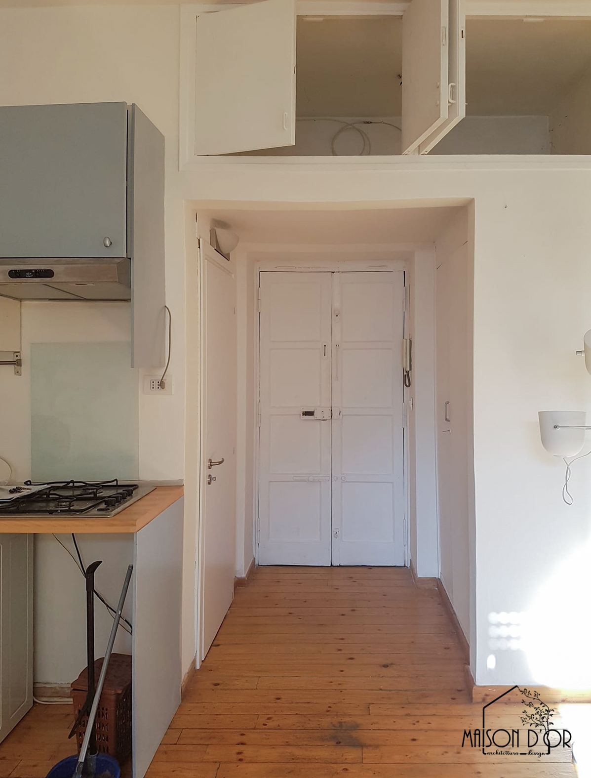 Il piccolo appartamento, derivato dal frazionamento dell’unità precedente per essere destinato a monolocale, è di appena 26 mq e si affaccia su una corte interna di una palazzina anni 60.