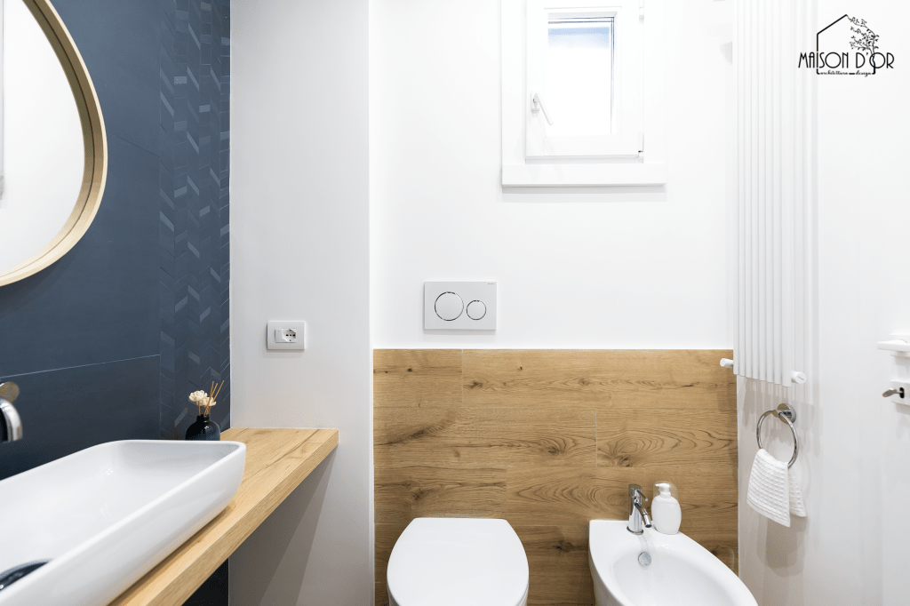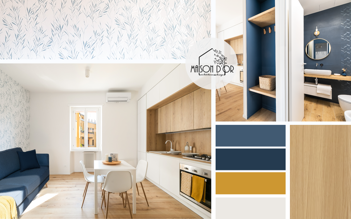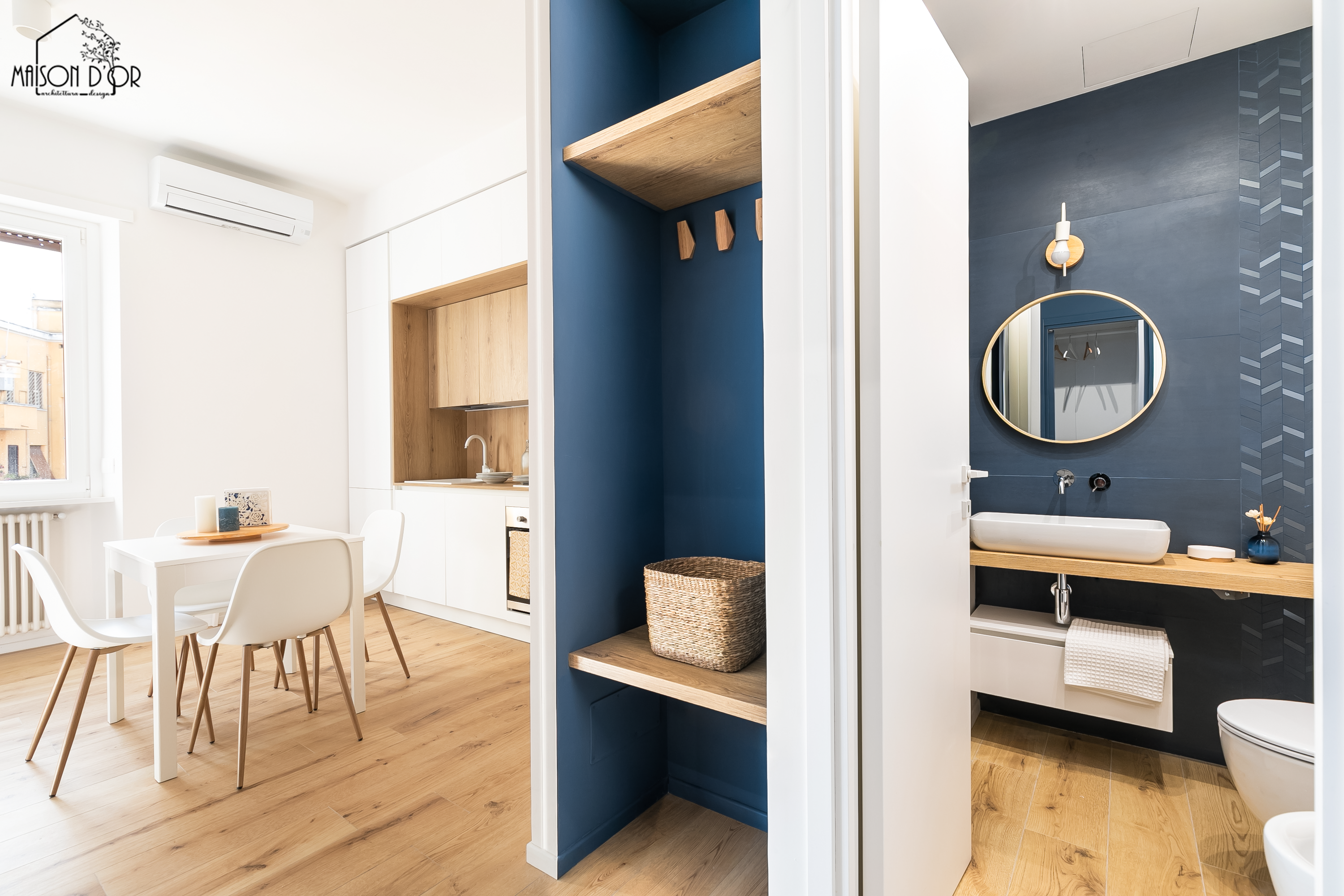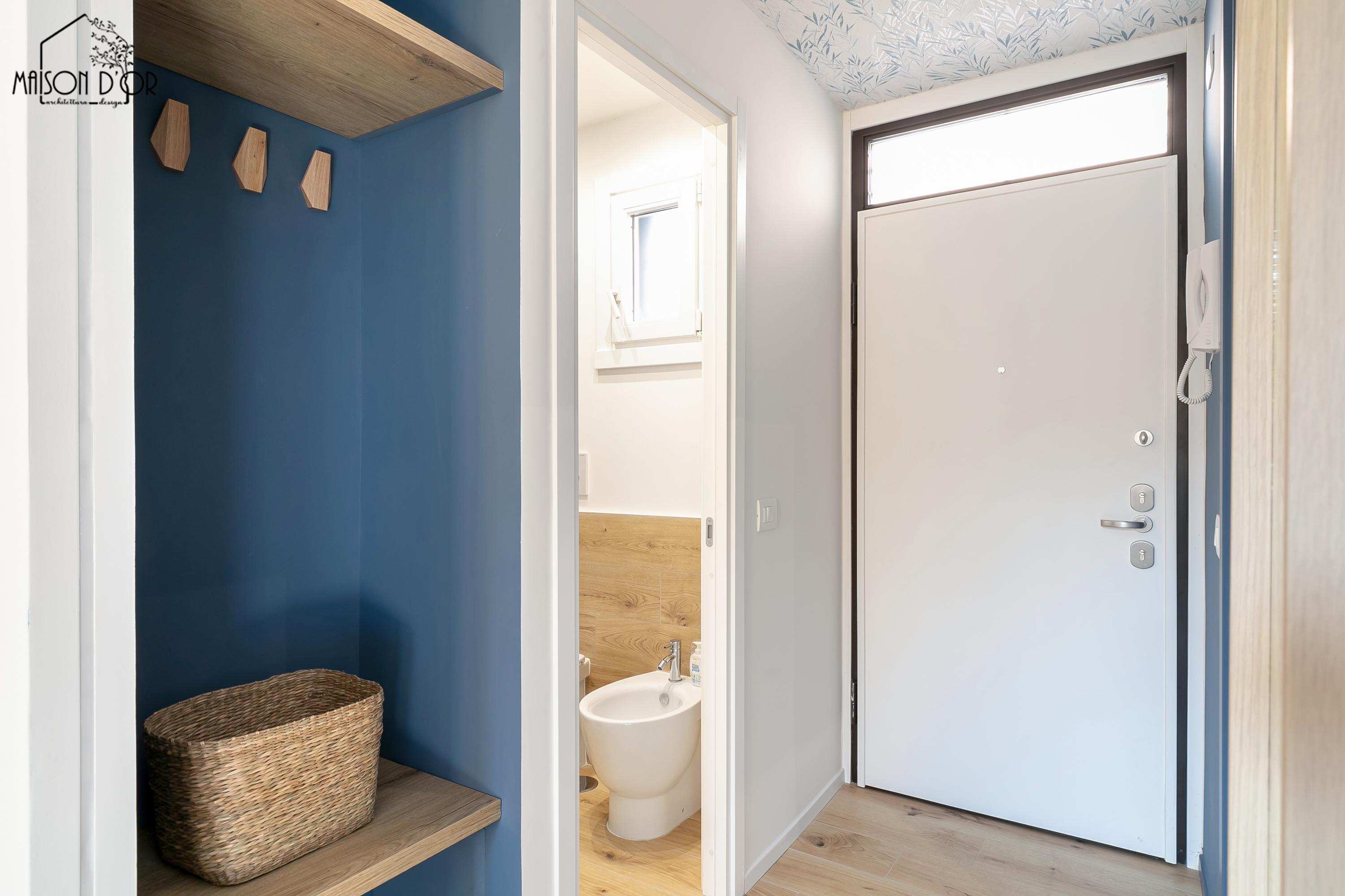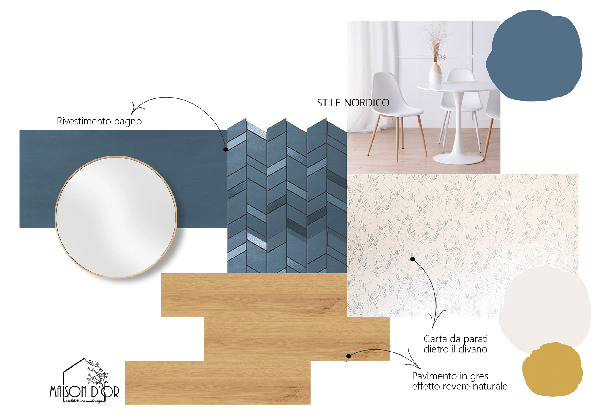 Abbiamo scelto uno stile nordico, con linee essenziali e materiali naturali come il legno chiaro, arricchito da un colore guida (tanto caro a R.): il blu.