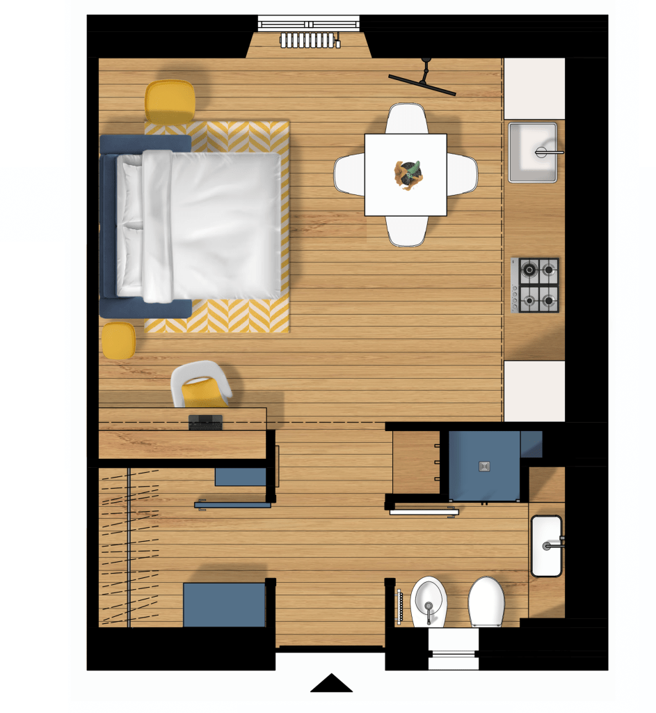 Abbiamo lavorato per ottenere la massima flessibilità funzionale e comfort in pochi metri quadrati (pensando ad un ambiente adatto non solo a brevi soggiorni ma anche a permanenze più lunghe), attraverso una distribuzione razionale degli spazi e soluzioni in grado di adattarsi alle diverse ipotesi d’uso.